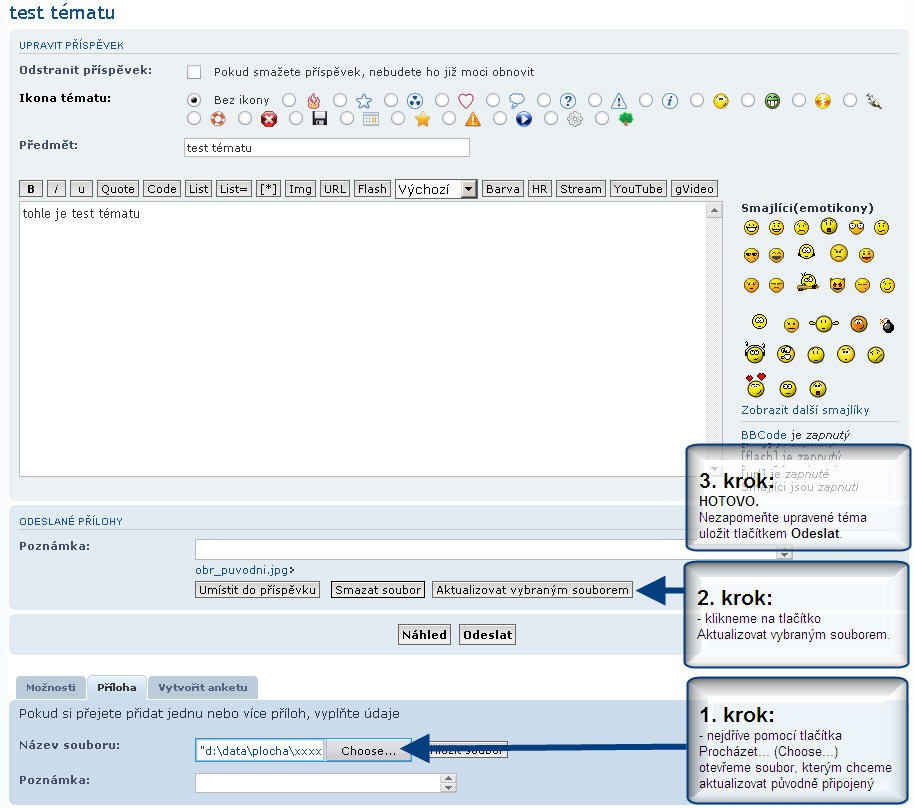 Dnes jsem do fóra instaloval MOD pro aktualizaci připojených souborů (dle návrhu od Honzi Paška ZDE). Znamená to, že již nebude potřeba v případě aktualizace přílohy původně připojený soubor mazat a připojovat nový. Nyní stačí POUZE vybrat nový soubor a kliknout na "Aktualizovat vybraným souborem" 8)