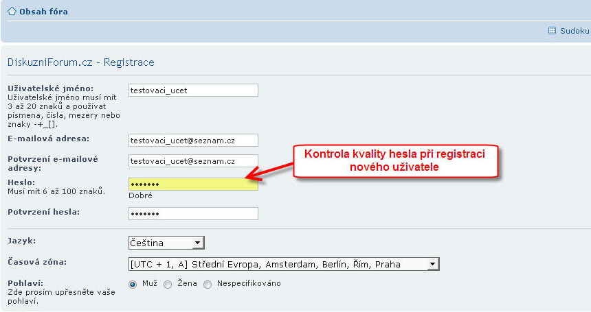 Dnes byla do fóra úspěšně instalována kontrola kvality hesla, která každému nově registrovanému uživateli sdělí, zdali je zadané heslo dostatečně silné.