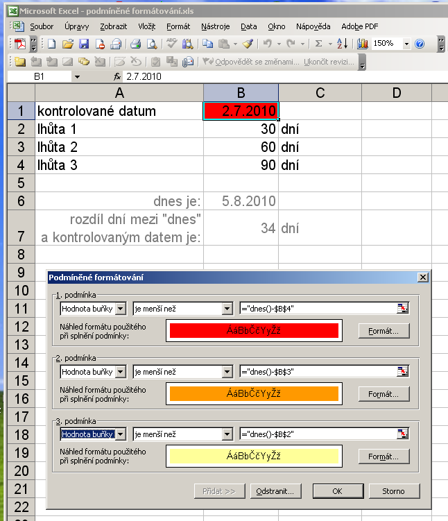 Popis : V buňce mám zapsané nějaké datum (starší než je dnešní). Úkolem je, aby po určitém počtu dní (na ukázce nazvaném lhůta) došlo ke zformátování buňky (barevné zvýraznění). A to bych chtěl využít trojstupňově (např. pro 30, 60 a 90 dnů, různé zformátování), jako je počet podmínek u podmíněného formátování v Excelu.