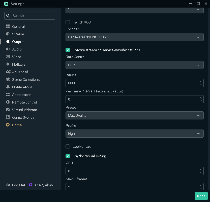 Ahoj, bitrate 6000 kbps, rozlišení přes NVENC by to mělo dát i 1080p60