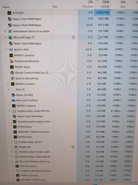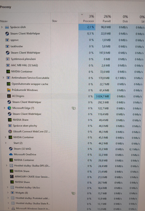 po odehrání 6h jsem hru vypnul a výsledky jsou takové viz fotky CPU a RAM je vidět, že hra Assassins creed Origins na pozadí stále je a win 11 není schopen ukončit úlohu, jiné programy šly zpočátku spustit, ale pak se to kouslo