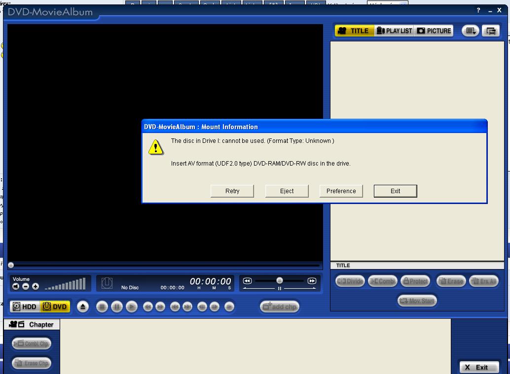 Píše to neznámý typ disku a máš použít přepisovatelné disky DVD-RAM nebo DVD-RW.