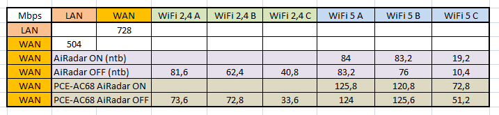 Jak jsem měřil - na portu WAN připojen PC se SSD diskem, na portu LAN taktéž PC s SSD diskem. Sdílená složky z PC WAN byla namapována jako síťový disk na PC LAN. Měřená rychlost je zjišťována prostým kopírováním souboru z jednoho PC na druhé. Pro měření WiFi byl použit notebook a stolní počítač s instalovanou PCIe WiFi kartou Asus PCE-AC68 https://www.czc.cz/asus-pce-ac68/134243/produkt . Zároveň jsem využil možnosti vypnutí technologie AiRadar pro porovnání rychlosti se zapnutým a vypnutým AiRadarem. Co se týče měření v pásmu 2,4 GHz, to berte s rezervou, v mém okolí je na této frekvenci 22 sítí a výsledky jsou silně závislé na denní době. Položka "A" je vzdálenost 1m od routeru, "B" 3m přes jednu zeď, "C" 9m tři zdi, měřeno v klasickém paneláku. Sice to není žádné laboratorní prostředí, na druhou stranu lze se těmito výsledky řídit při nasazení v reálném prostředí.