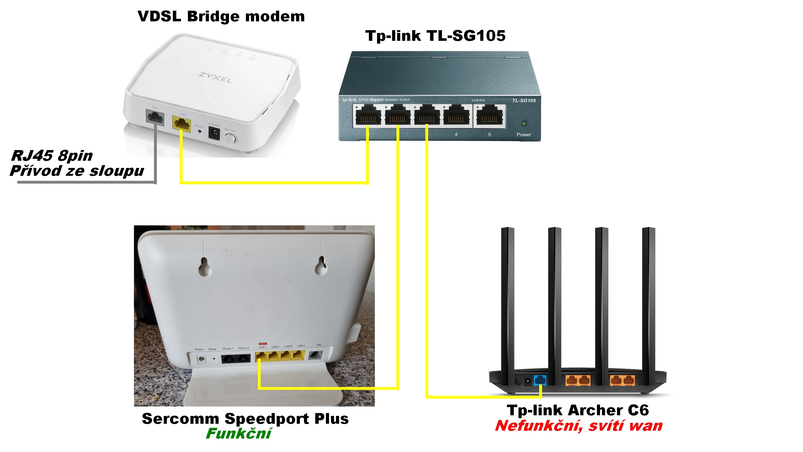 Jak jsem vše zapojil mám jednoduše naznačeno v obrázku. Já jsem doplnil switch pro rozdělení internetu a Tp-link router. Zapojení toho jejich vdsl bridge jsem neměnil. Z jakého důvodu mi nejde internet na přidaném Tp-linku? Co tak chápu, tak přece DSL zde není aktivní ne?