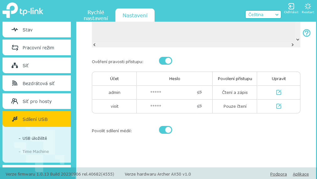 Je vhodnejsi to sdileni medii vypnout, protoze se to pere s overenim pristupu. Vice viz ikona napovedy ve web.rozhrani routeru.