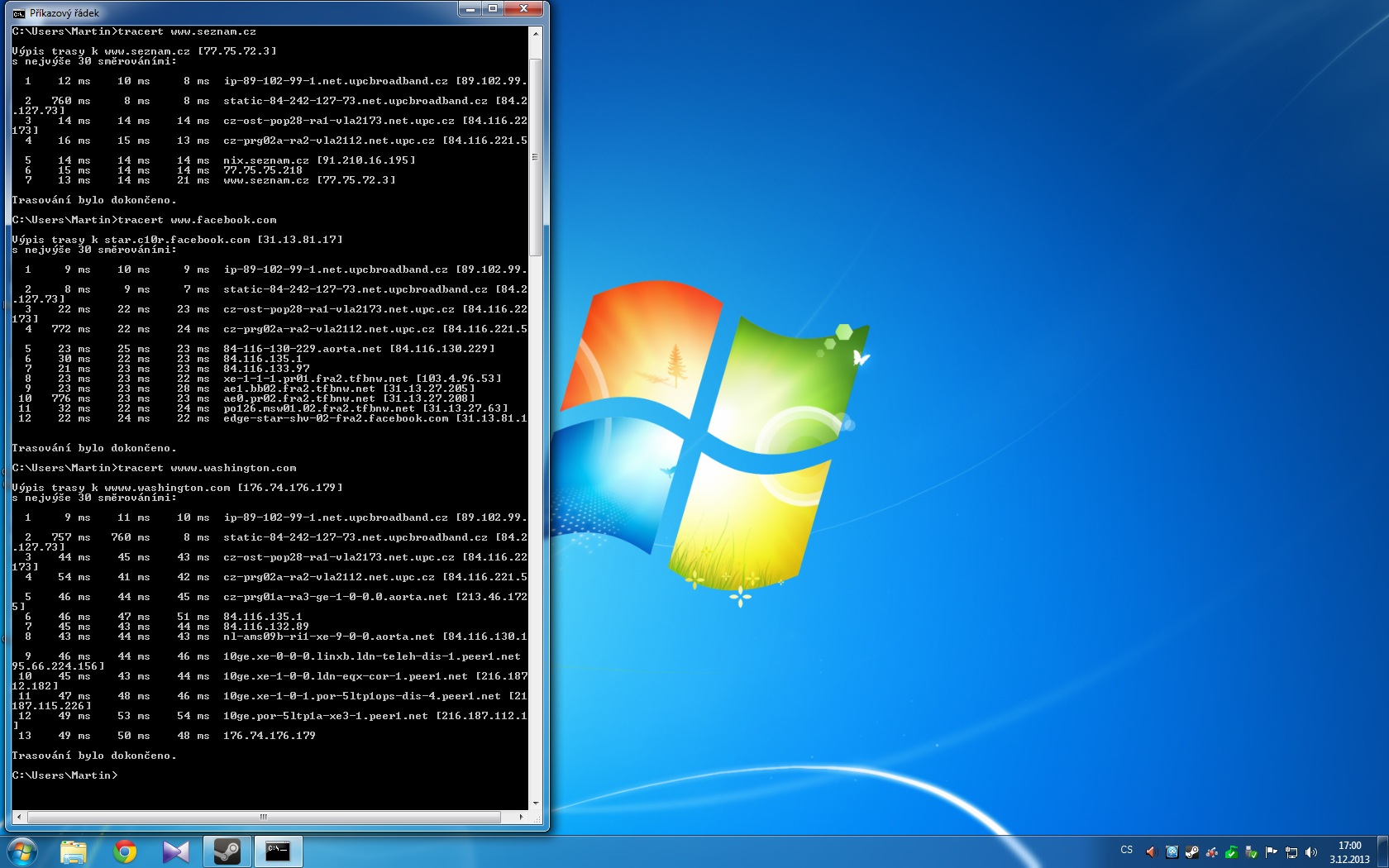 právě že jsem vzal a jenom sebe napíchl,od modému jen ke mě žádny jiný pc nejel ani wifi.. je to od UPC 120+ (MB/s) v mariánkach kde říkaly že je jedno z nejlepších pokrytí v čr.. router je linksys e1200 . mám tu od taťky ještě snímek s trasování a kamaráduv..napadlo mě že i pc nestíha ubral sem nároky na nejnižší ale furt stejne...modém je taky zakoupený od společnosti UPC. příkládam zde 3 výsledky trasování,jedno je moje,druhé je od druhého pc (/od taťky) a třetí od kamaráda který má připojení o2 10Mb/s . žádne trrenty zapnute ani prohlížeče..nic