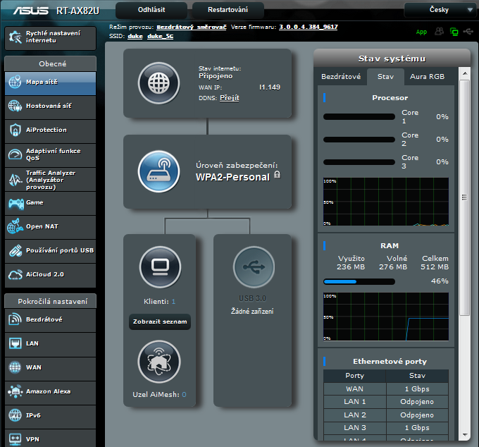 Dále už je to jednoduché - router si vyžádá změnu jména a hesla pro přístup k nastavení a taktéž přístupové údaje k wifi. Stejně tak si můžete zvolit standard WiFi6, popřípadě režim mesh. Kladně hodnotím to, že pokud router rozpozná, že existuje novější firmware, automaticky se dotáže na aktualizaci. Pokud vše proběhlo v pořádku, zobrazí se stavová stránka routeru. Zde můžete zkontrolovat wifi, zatížení procesoru a paměti a lze zde nastavit podsvícení routeru.