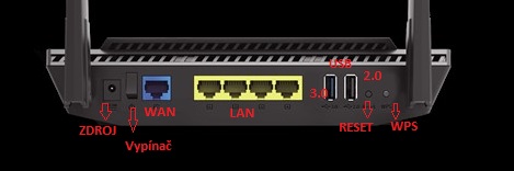 Všechny přípojné body a ovládací prvky jsou na zadní straně routeru: Najdete zde zdrojový konektor, vypínač, WAN a LAN porty, 2x USB port (jeden 3.1 a jeden USB 2.0), tlačítko RESET a WPS. Jsou zde i dvě antény připojené napevno.