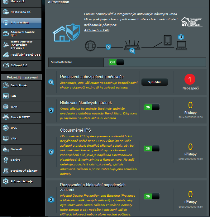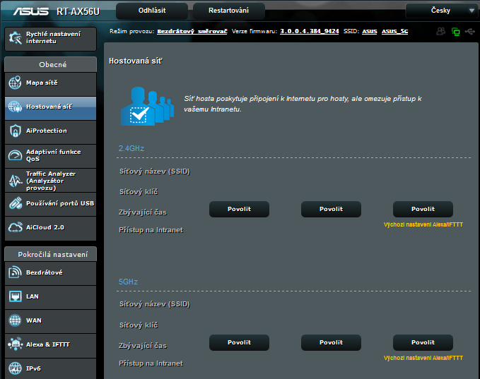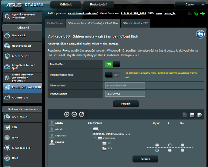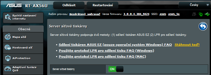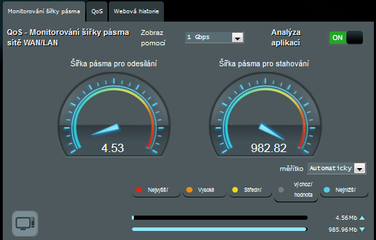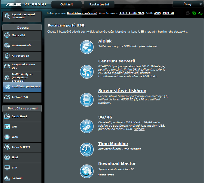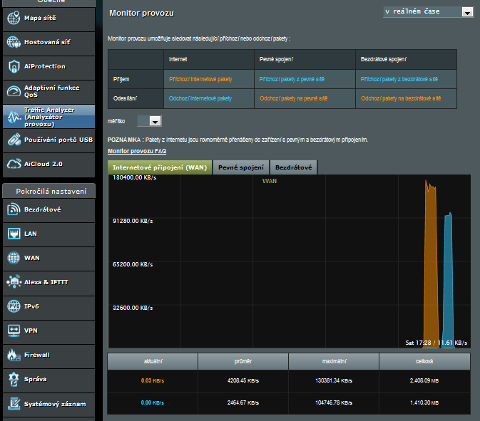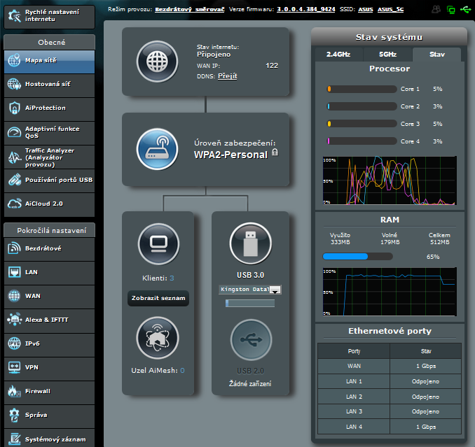 Nastavení routeru je jednoduché, jak už to tak u asusu bývá. Po připojení routeru postačí do prohlížeče zadat router.asus.com a dostanete se do rychlého průvodce, který vás provede základním nastavením. Kladně hodnotím, že jste nejdříve nuceni změnit heslo pro přístup do routeru, poté i heslo pro nastavení přístupu k WiFi. A po proběhnutí nastavení vás už uvítá klasická obrazovka (zde jsem router zatížil přenosem dat, aby bylo něco vidět v grafu): A nyní je to na vás. Přejete si nějakou funkci otestovat? Chcete s nějakou funkcí seznámit? Klidně se ptejte.