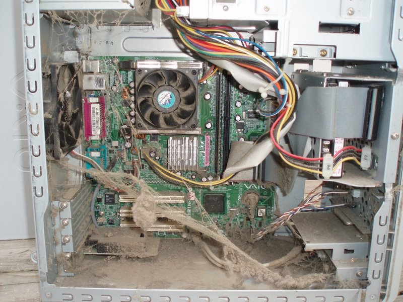 Tak mám pro vás fotky PC mého spolubydlícího. Osobně stolní PC nemám a svůj notebook raději ukazovat nebudu. :D Některé způsoby opravy stojí opravdu zato. :D Například napájení větráku. Konektor na základové desce odešel, takže dráty jsou vyvedené ven a zapojené do USB. :D