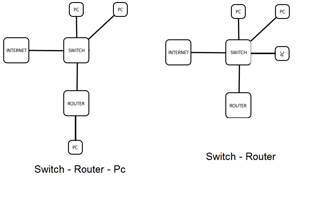 Chapal bych zapojeni internetu do routeru, z nej do switche (vnitrni sit) a odtud do pocitacu.