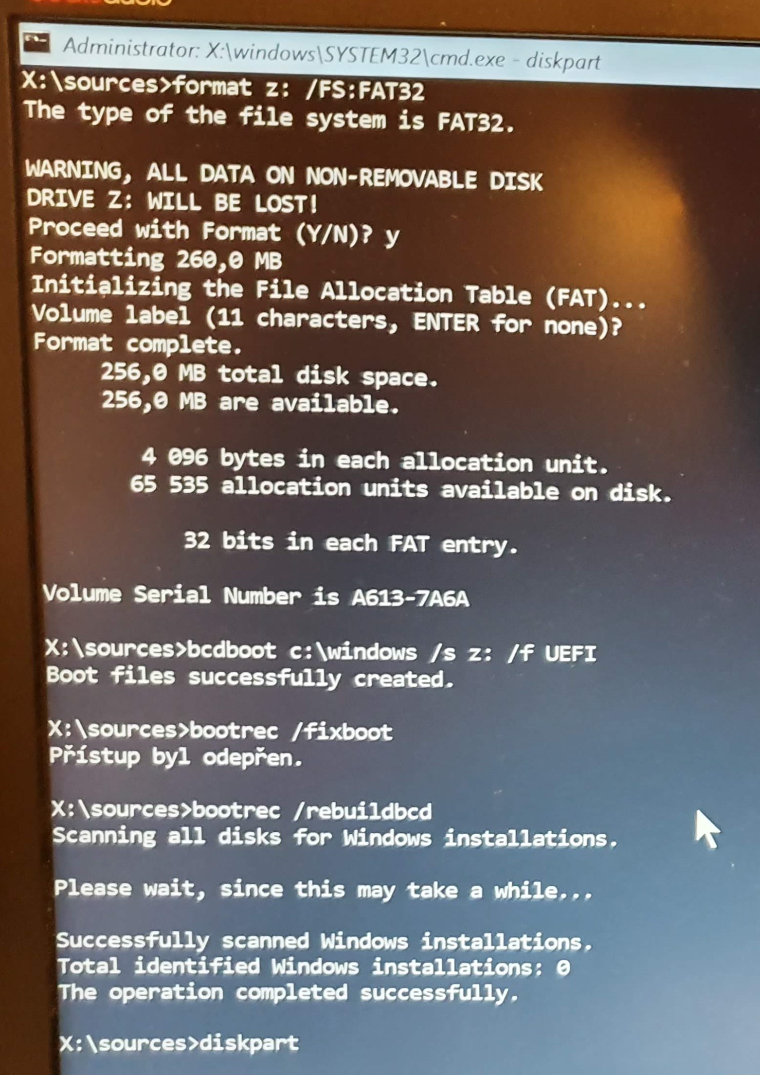 Dokonce jsem udělal format z: znovu vytvořil adresař Efi\Microsoft\Boot . Opět odepřeno. Další pokus je vidět zde: