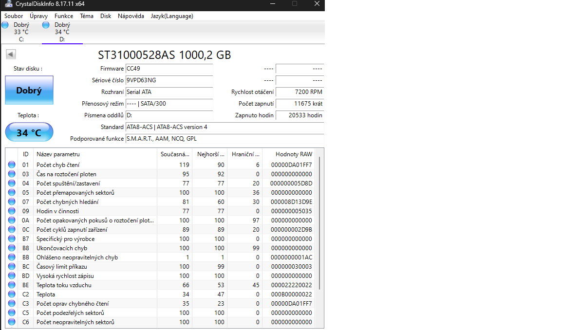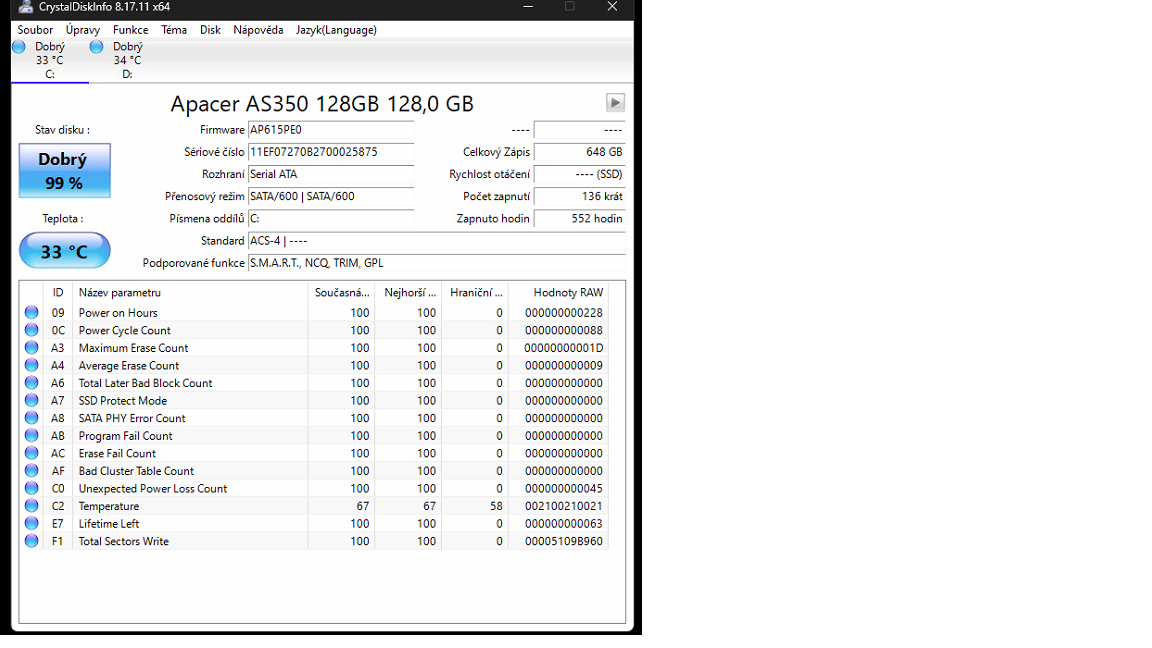 V úvodu píšeš, že máš 250GB Kingston, ale na obrázku je Apacer 128GB + 1TB Seagate. Je chybně popis nebo jsi dal omylem jiný snímek z Crystal Disk Info. Nebo tam máš více disků?