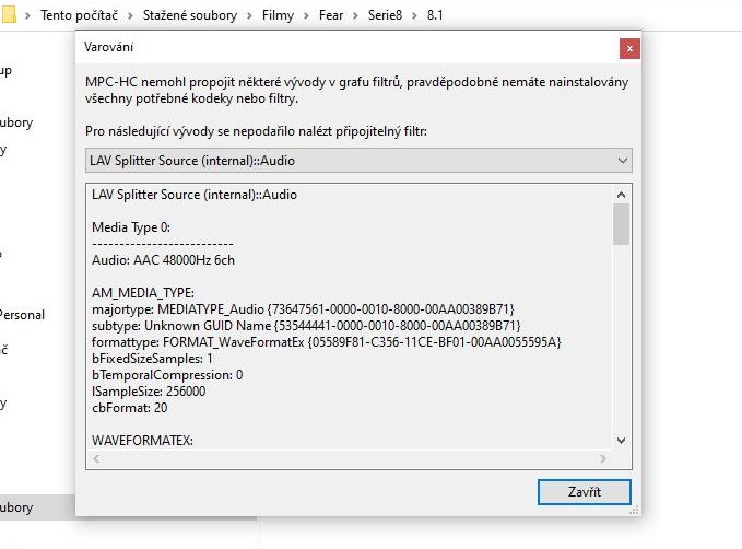 Dnes jsem si stáhnul tři díly nové serie Fear Walking. A po spuštění mi nejde zvuk před tím ještě vyskočí hláška.Viz. obr. Díly jsou stažené v různých formátech /MP4, MKV/ ovšem nejde to nikde. Stáhnul jsem ten LAV ale jen nainstaloval nevím jestli se má i nějak upravovat. Přehrávač používám MPC-HC, ale zvuk nejde ani ve Windows MediaPLayer ani v přehtrávači médií. Všechny ostatní videa mi jdou. Jen ty tři díly co jsem dnes stáhnul. ...Teď jsem dojel čvrtý díl a ten jde! Převádím si videa na formáty co mi jdou v TV v programu AnyVIdeo Player a tam nejdou ty videa ani vložit, hned se program zavře. Můžu zkusit stáhnout jiný, ale to není řešení. Najmě při mé rychlosti netu, když ani nevím jestli to půjde.