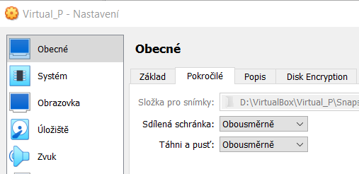 Na WIN10 PRO jsem nainstaloval VirtulBox a do něj virtuální WIN10 PRO. Povolil jsem schránku a tažení myší takto: