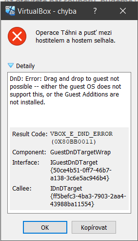 A když chci z hostitele WIN10 nakopírovat cokoliv do vrituálu (i obráceně), tak to nefunguje (ani přes schránku ani tažení myší):