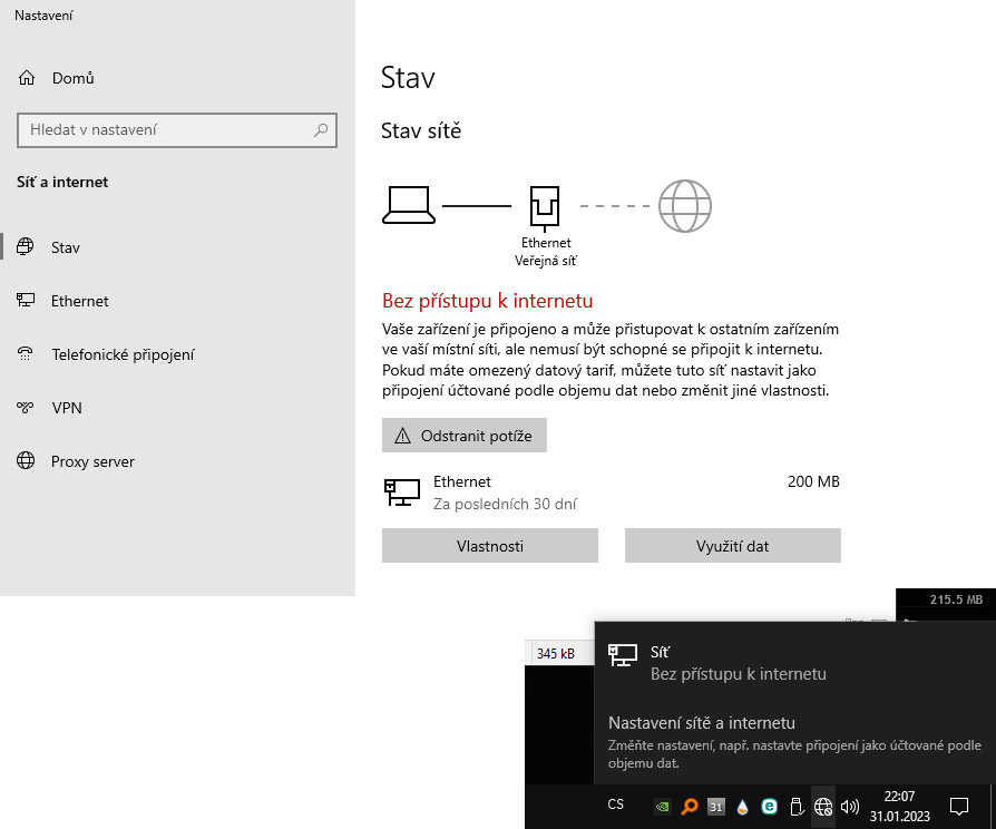 Ikona zeměkoule u hodin se zobrazuje s proškrtnutým kolečkem – tj. internet by neměl být přístupný (viz screen). Přitom ten normálně funguje. Zkusil jsem reset sítě, reset routeru, všechno, na co jsem pomyslel. Čím to může být?