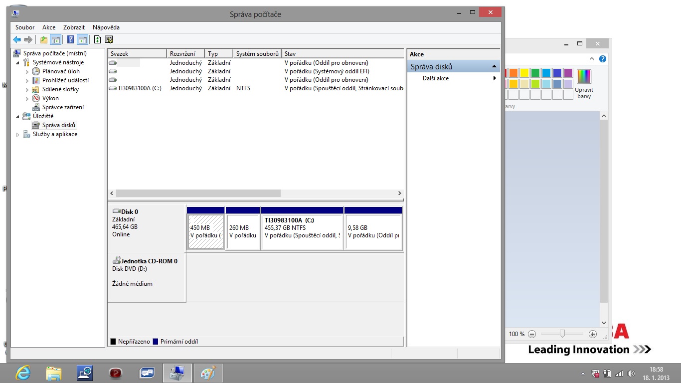 Správa systému vypadá takto. Podle všeho tedy nějaký recovery oddíl je (respektive jsou dokonce dva), pak něco dalšího a pak normálně Céčko... Manuál k notebooku je uložený v počítači, ale nic o záloze systému nebo o práci s Win8 se tam nepíše