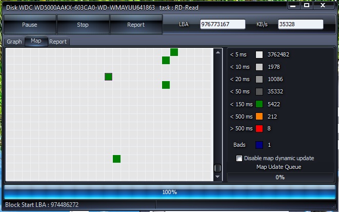 Včera jsem opravil systémové soubory pomocí příkazů DISM a SFC. Ale nepomohlo to. Dnes počítač opět nenastartoval řádně. MEMTEST86+ žádnou chybu nenašel, takže RAMka je v pořádku. Povrchový test disku s programem HDScan nalezl 1 vadný blok a několik tisíc pomalých bloků. Zde je obrázek: