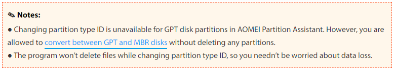1. Dle toho článku z odkazu aomei NEUMÍ provést set id nad GPT diskem. Viz. poznámka, kterou v minulém příspěvku zmiňuji:
