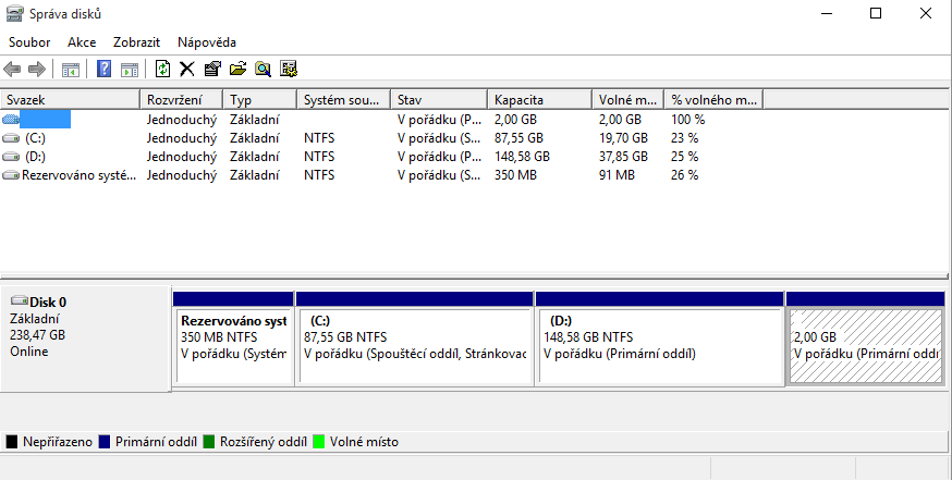 Viz. příloha - disk0 jedna primární, jedna rozšířená partition a v ní dva logické disky.