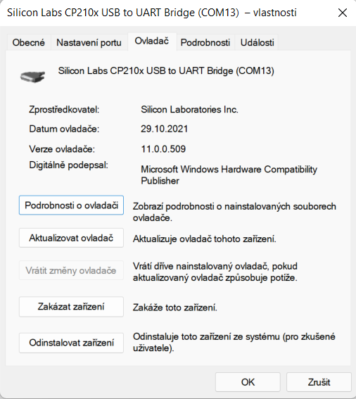 Na tom COM 13 je CP210x driver, který mí na tomto počítači pod Win 10 fungoval.