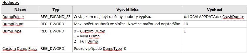 Hodnoty v klíči viz. tabulka: V takovém případě se dump vytvoří automaticky vždy po pádu aplikace.