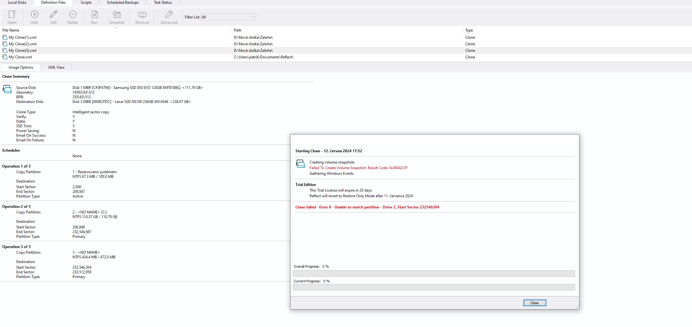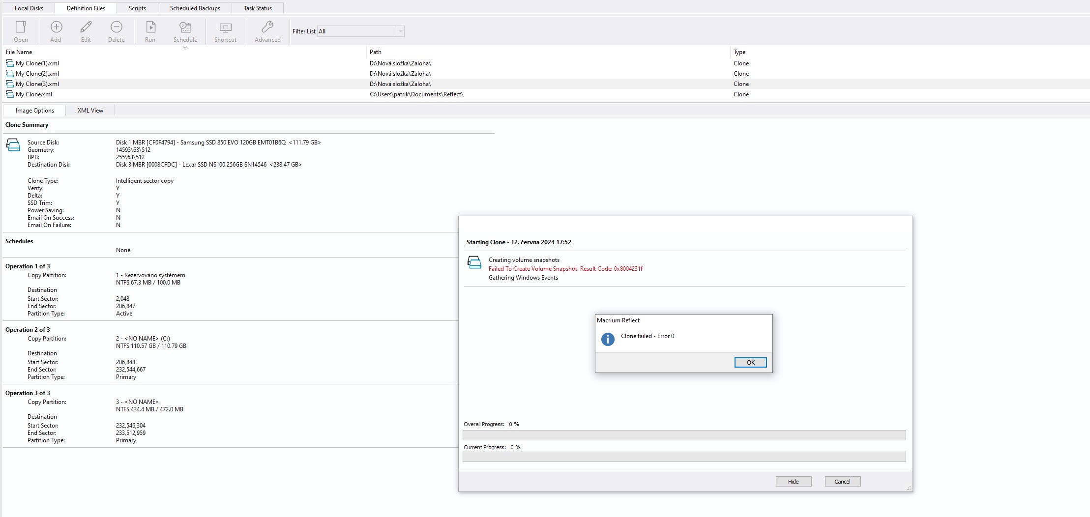 Ta první chyba by mohla být tím, že máš hrozně málo volného místa na disku C, což nestačí pro vytvoření "snapshotu" nutného pro následné zahájení klonování.