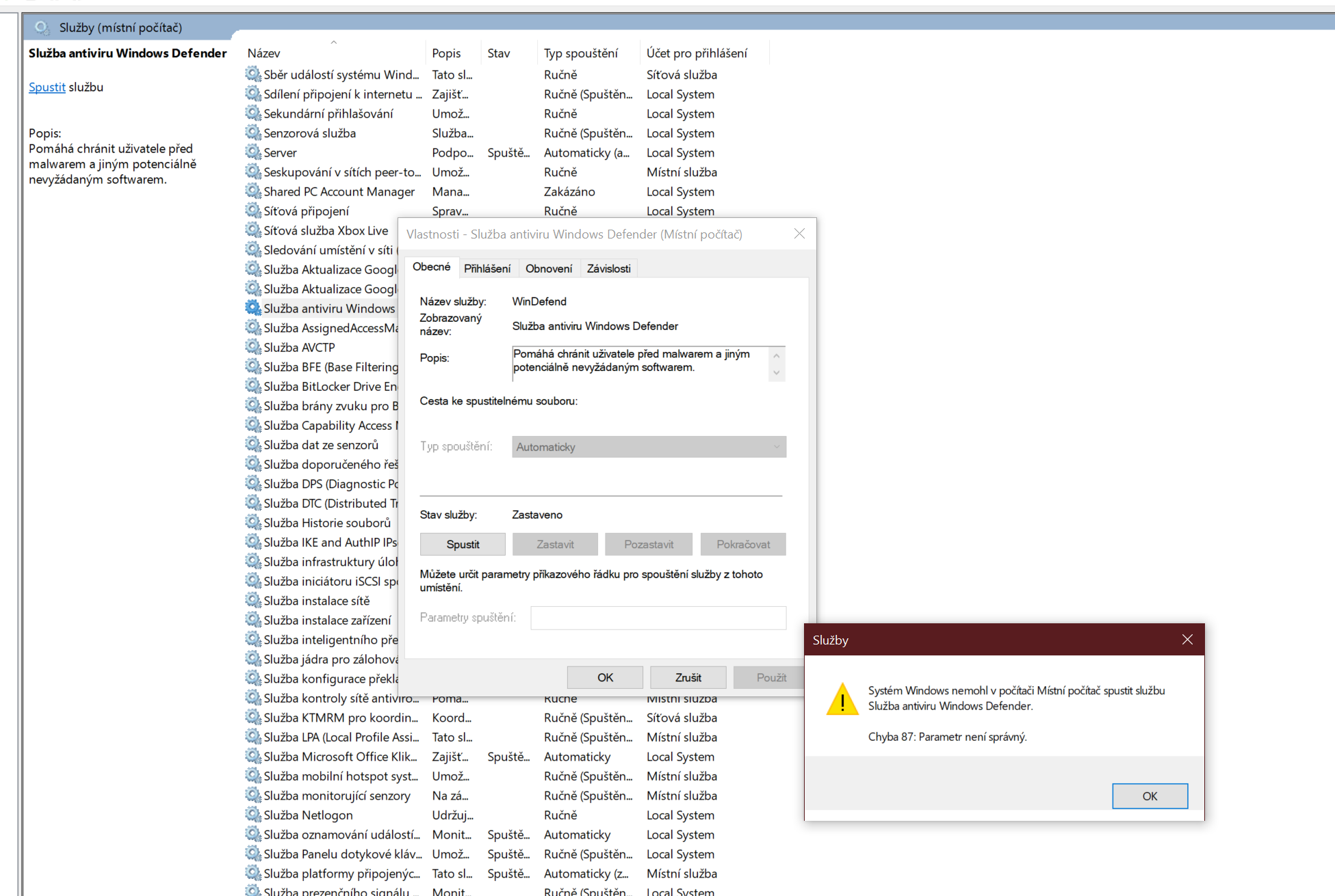 Nejde spustit windows Deffender