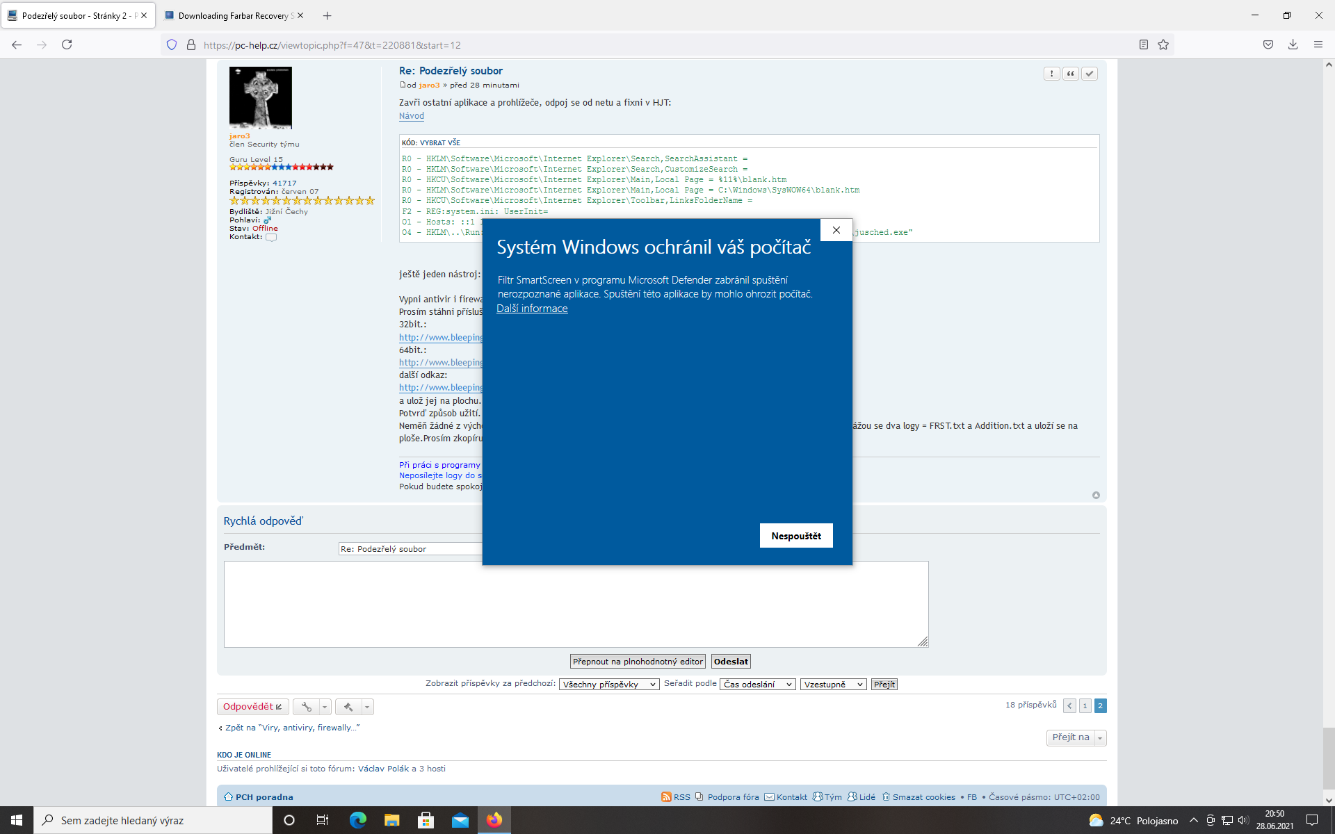 FRST při prvním spuštění vyhodil tuto hlášku. Dal jsem další informace - přesto spustit