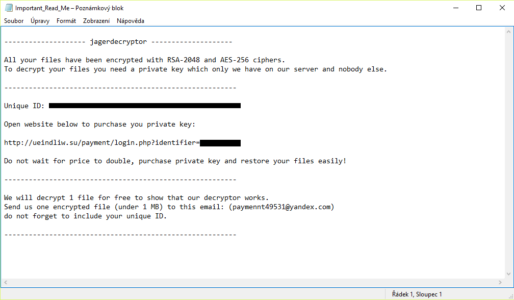 Dobrý den. Někdy večer jsem dostal tenhle virus který se jmenuje jagerdecryptor. Poznámkový blok se otevře teď hned po zavirováním mého Notebooku. Otevře se taky každé zapínáním Notebooku. Píšou tam, že musím zaplatit na dolary. Po několika hodin, cena se zvýší! Ale po 72 hodin, všechny moje soubory nebudou vymahatelné!!! Spyhunter 4 ani nechce mi pomáhat... Jenom chtějí pěníze zase na dolary. Můj táta by asi mě něco udělal... :cry: Máme hold jít do Datartu na opravu nebo to mám udělat ručně? :oops: Děkuji.