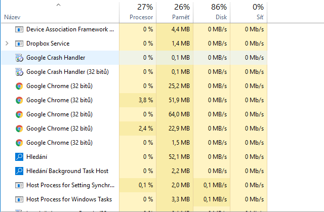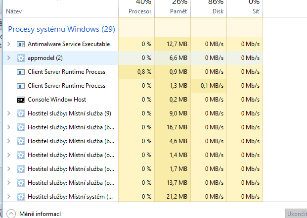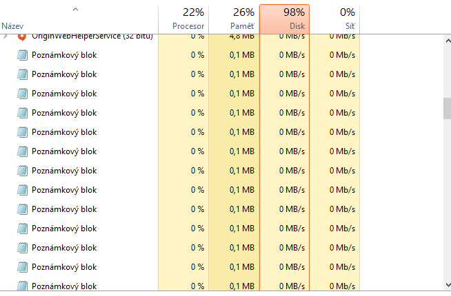 EDIT: Tech procesu poznamkovy blok je zapnuto spise tak 50. Vsechny maji vytizeni procesoru 0,1% a pamět 0,1MB