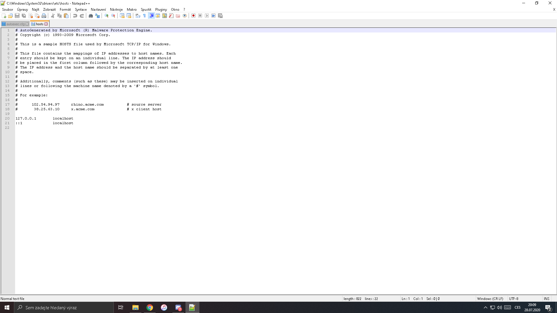 Po restartování pc takto vypadá můj host file. Nic tam neni připsáno a pokud se nepletu takto by měl vypadat defaultně ne? Děkuji předem za pomoc