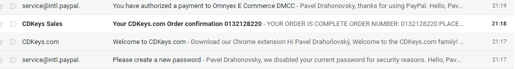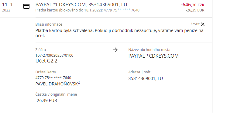 Navíc jsem změnil heslo u toho účtu do e-shopu, kde si za mě koupil hru, aby nemohl získat aktivační kód do hry; a e-shop samozřejmě vyrozuměl o tom, co se stalo. Refund dostanu od PayPalu.