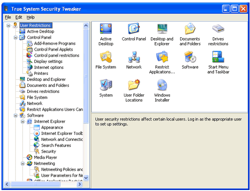 Použite ho na vypnutie funkcie systému pre niektoré používateľské profily, skryť položky ponuky Štart a Otvoriť-Uložiť možnosti. True Tweaker má jednoduché, ale pekne navrhnuté rozhranie pre výber viac ako 470 možností zabezpečenia pre váš systém. Zdrojový kód Delphi je tiež k dispozícii.