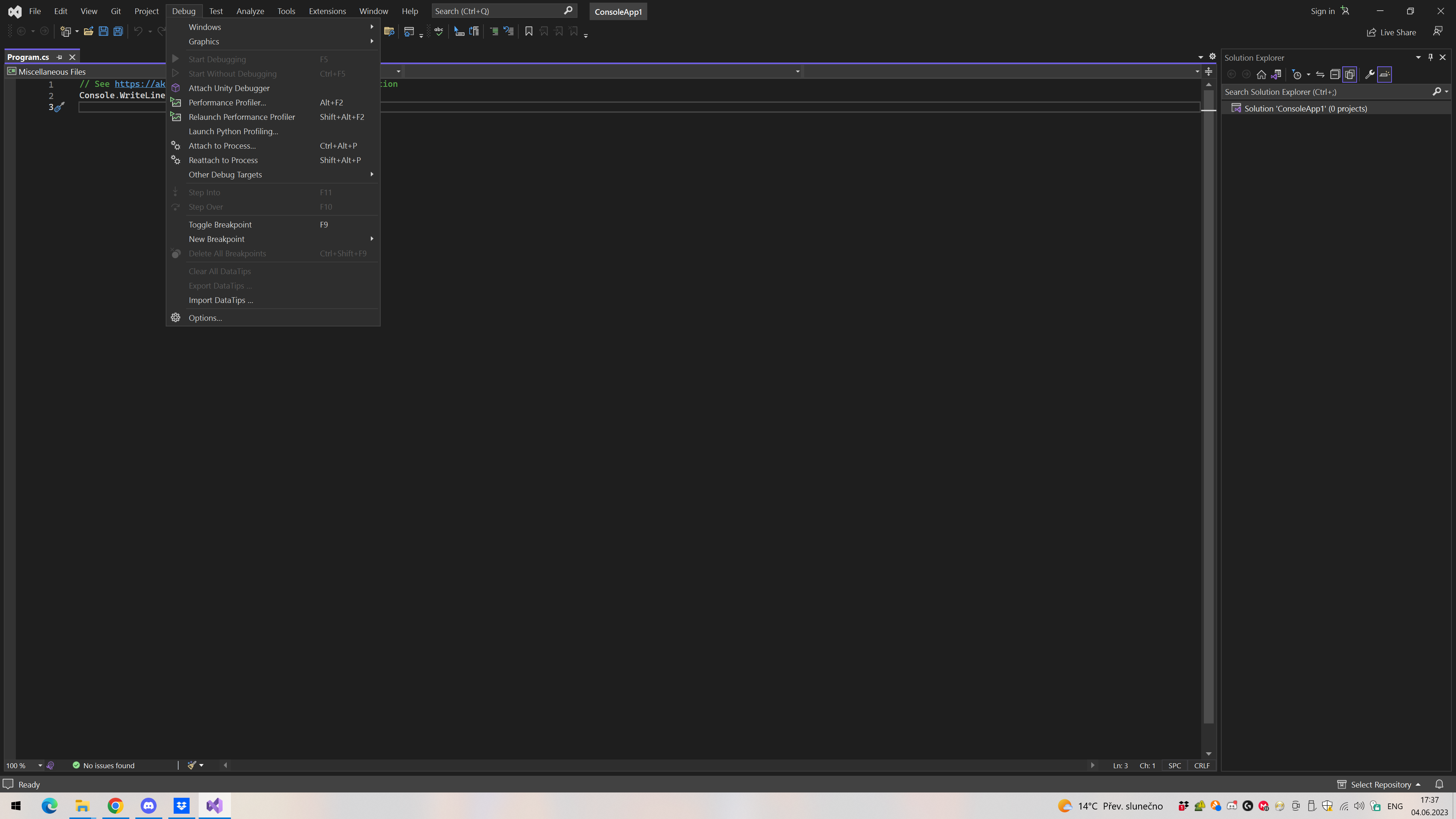 Debugging v Console App pro C# by měl fungovat bez problémů, pokud máte správně nastavený projekt a spouštíte ho v režimu Debug. Pokud se vám nedaří spustit debugging ani klávesovou zkratkou F5, může to být způsobeno několika možnými příčinami. Například: