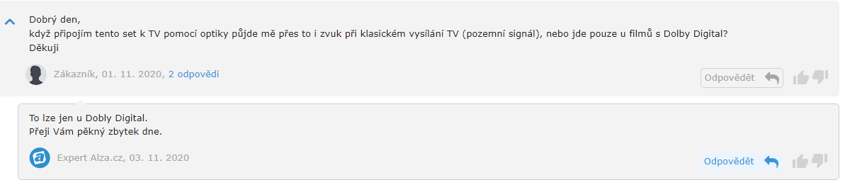 plánuju si koupit Soundbar Sony HT-S20R a úplně si nejsem jistej, jak je to s kompatibilitou při zapojení k TV. Soundbar má možnost připojení přes HDMI ARC, optickym audio kabelem a analogově. Mám TV SAMSUNG LE32B650T2W, která zřejmě nepodporuje HDMI ARC, takže bych SoundBar připojil optikou. Někde jsem ale četl, že při sledování klasického pozemního vysílání v TV nepůjde zvuk vůbec, protože Soundbar podporuje pouze Dolby Digital, je tomu skutečně tak? Znamená to teda, že by šel přehrát zvuk pouze u kanálů, které podporujou Dolby Digital? Já osobně mám teda kabelovou televizi od UPC a v jejich nabídce vidim, že Dolby Digital podporuje jen pár kanalů, například Nation Geographic, znamená to teda, že by zvuk šel pouze na této stanici a jinde vůbec? Nebo by na ostatních programech nebyla pouze dostupnost 5.1 systému, ale zvuk by normálně šel i přes Soundbar. Televize jako taková jinak Dolby Digital podporuje.