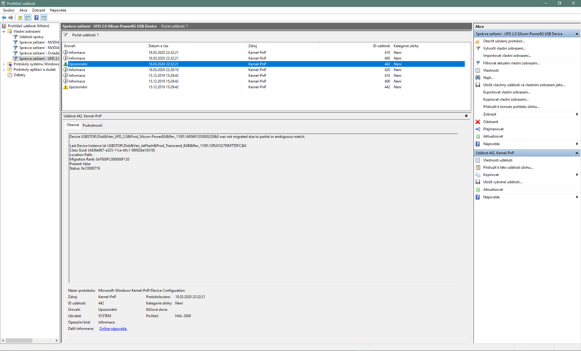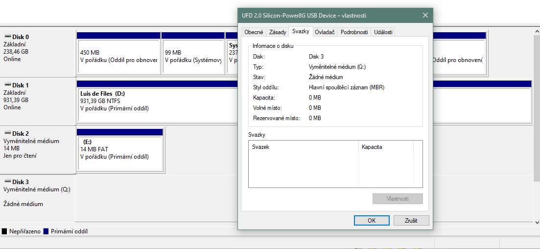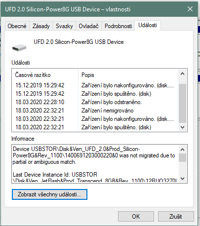 mám 8GB flash disk s označením: UFD 2.0 Silicon-Power8G USB Device který nelze načíst (zkoušel jsem na 3 různých počítačích a různých portech). Jediné, kde je viditelný je ve správě disků, kde se při zapojení "načte" jako vyměnitelné medium s přiřazeným písmenem, pod kterým je napsané žádné medium - ve složce tento počítač však vidět není. CO je ve vlastnostech a v následném prohlížeči událostí zasílám v printscreenu.. Snad s tím něco půjde dělat. Disk je málo používaný a celkem nový.. Předem díky za jakýkoliv tip.. Printscreeny níže :