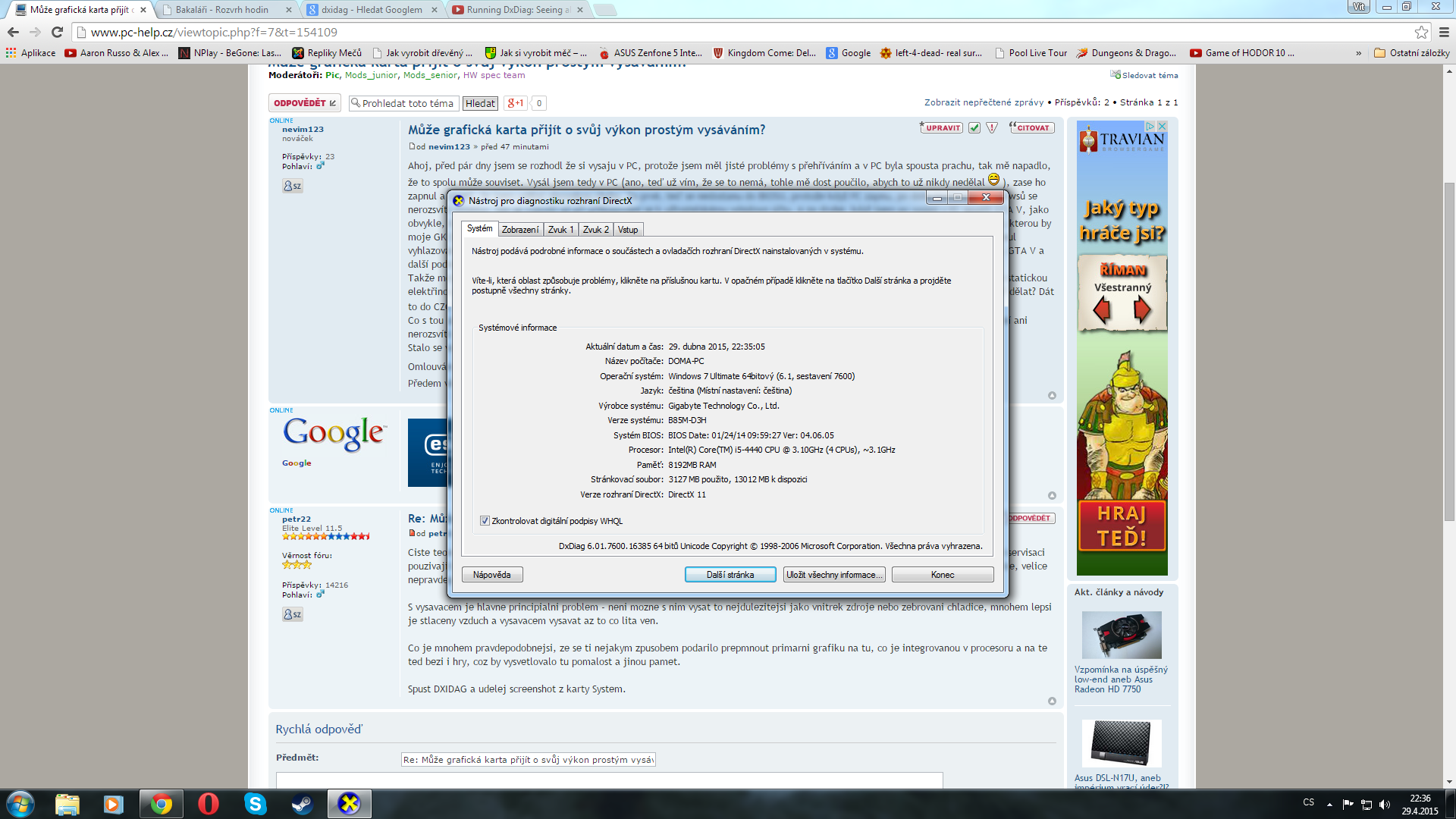 ), zase ho zapnul a zjistil, že jsem udělal obrovskou chybu. Za prvé, teď se nedostanu do BIOSU, protože když PC zapnu, po dobu bootování Windowsů se nerozsvítí monitor, ten se rozsvítí až při přihlasování se k uživatelskému windows účtu. A za druhé, když jsem po vysání v PC spustil GTA V, jako obvykle, byl jsem dost v šoku. V nastavení grafiky ve hře jsem si všiml využitelné grafické paměti. Místo klasické kapacity cca 3000MB, kterou by moje GK (R9 280) měla mít, byla max. kapacita grafické paměti pouze cca 1600MB. I když jsem dal všechno nastavení na normal, vypnul vyhlazování atd. , zapnul jsem benchmark, hra běžela v průměru pouze na cca 10-15FPS. Podotýkám že předtím jsem hry jako Skyrim, GTA V a další podobně náročné hry hrál většinou na vysoké až nejvyšší nastavení.