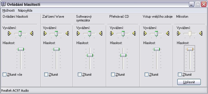 Yelkinson: tam už jsem se také díval a mám tam zaškrtlé "Skype může automaticky nastavit má zvuková zařízení" a i v tom výběru jak Výchozí zařízení Windows tak i Realtek AC97 a ani s jedním to stejně nefunguje. A jak je tam taková ta stupnice tak ta je u mikrofonu stále šedá...