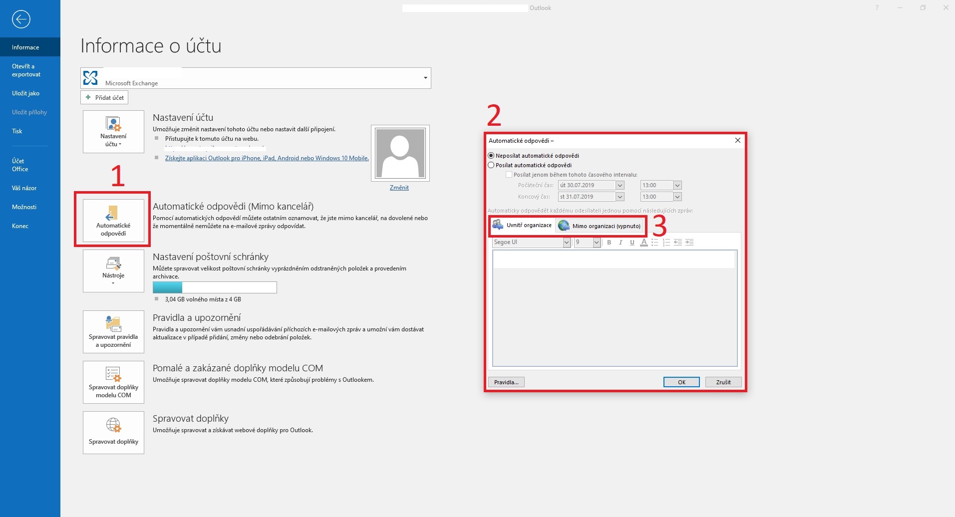 Ještě dolpním, že Out of Office bude fungovat za předpokladu, že máš účet připojený jako Exchange (např. viz. výše). V případě, že máš Outlook a účet mapovaný jako IMAP, můžeš si vytvořit pravidlo, které bude funkční stejně jako Out of Office, ale pouze za předpokladu, že bude Outlook klient neustále zapnutý. V takových případech je lepší, připojit se na Webmail a upravit tam, popř. napsat správci poštovního serveru.