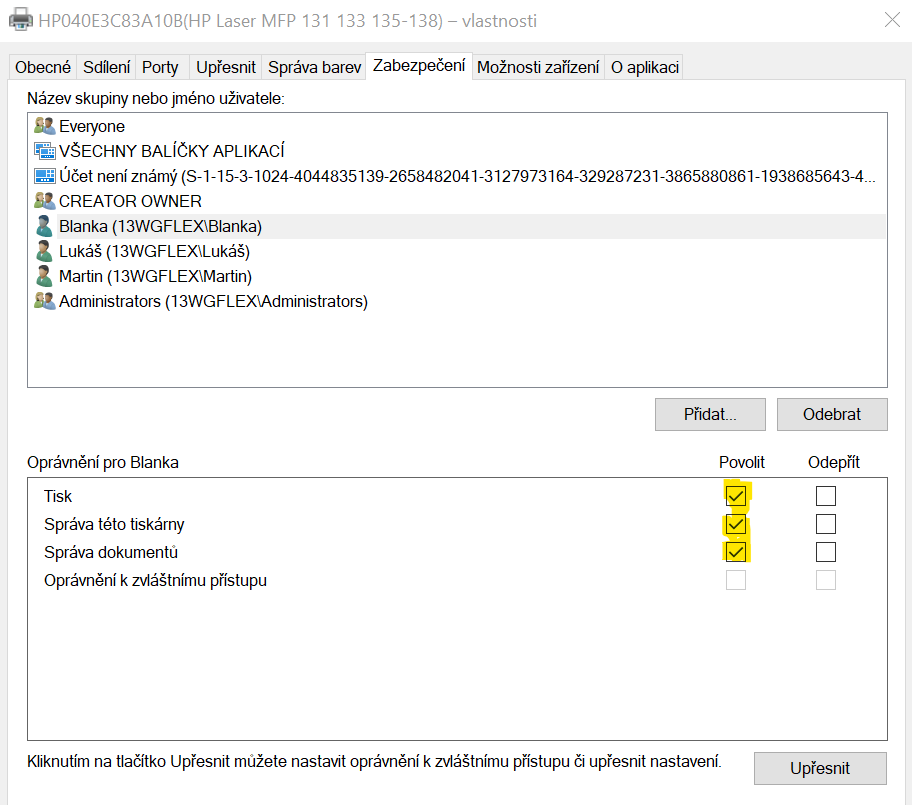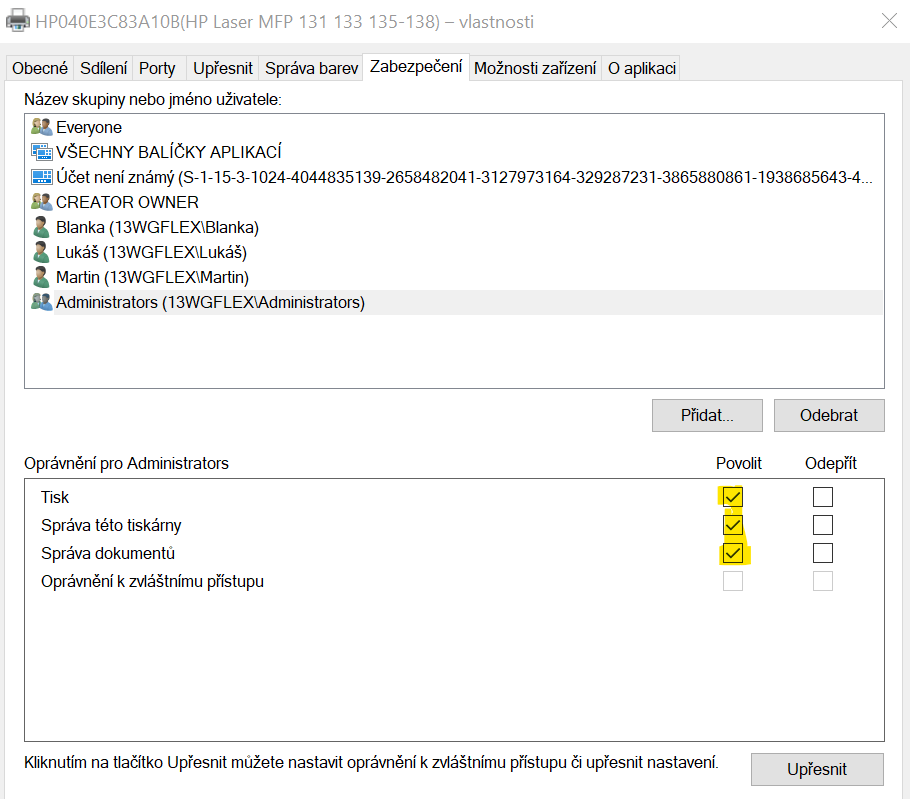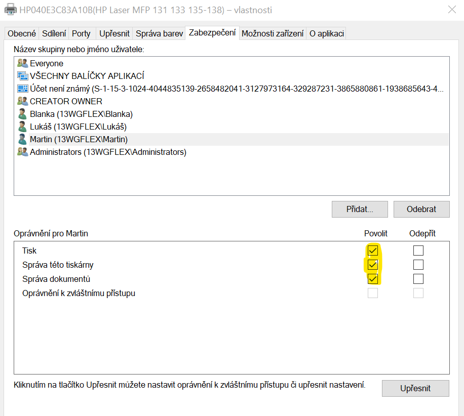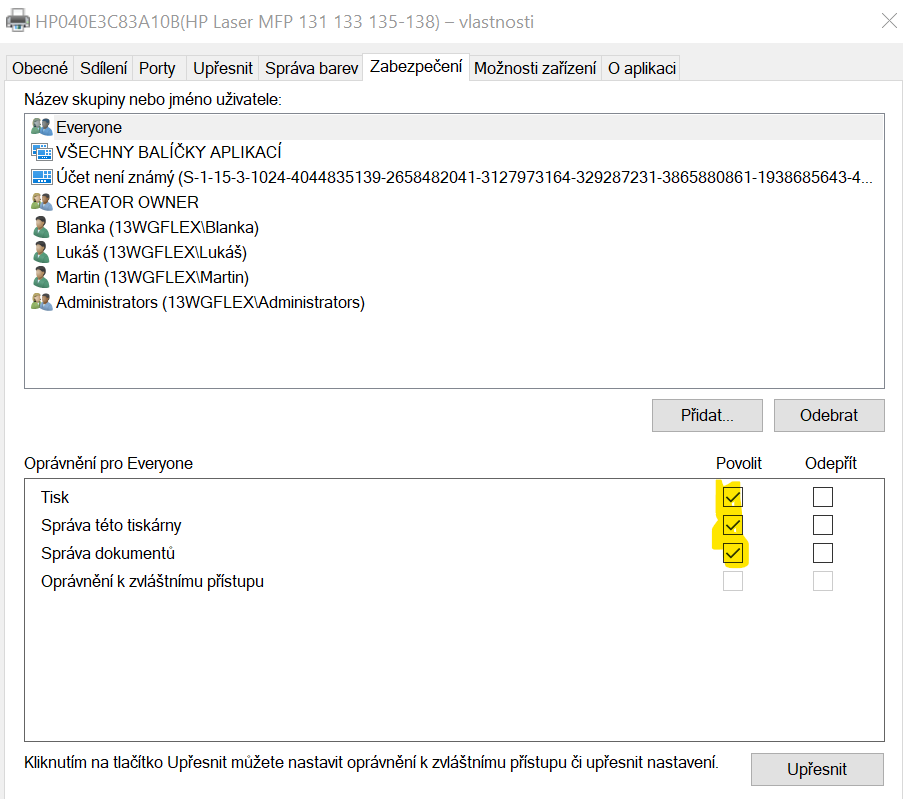 atari píše:Pokud si dobře pamatuji, tak v nastavení tiskáren bývá záložka zabezpečení. Tak bych na to zkusil kouknout a případně tam všude nastavit hodnoty "Everyone".