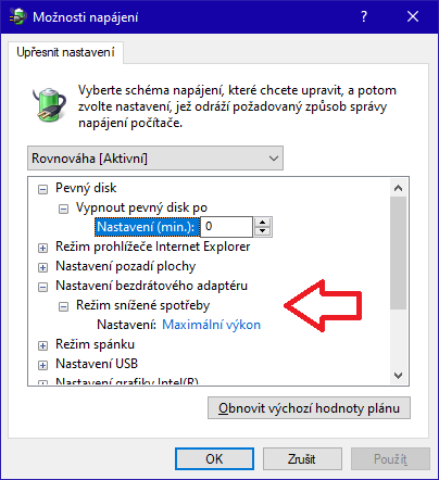 Nedaří se mi najít plán napájení. Ve win 11 mám možnost přepínat pouze mezi vyvážený, úsporný, vysoký výkon. Konkrétní možnost pro wifi adaptér jsem nenašel.