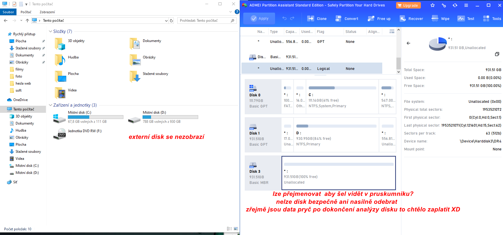 Prošel jsem to ještě jednou , a data tam už nejsou tam jsem vytvořil oddíl E: a už se načetl v průzkumníku . Jen se jestě zeptám když má extrerní disk kapacitu 1TB tak proč má teď kapacitu jen 931GB ? to si bere systém ten zbytek (69GB) ?
