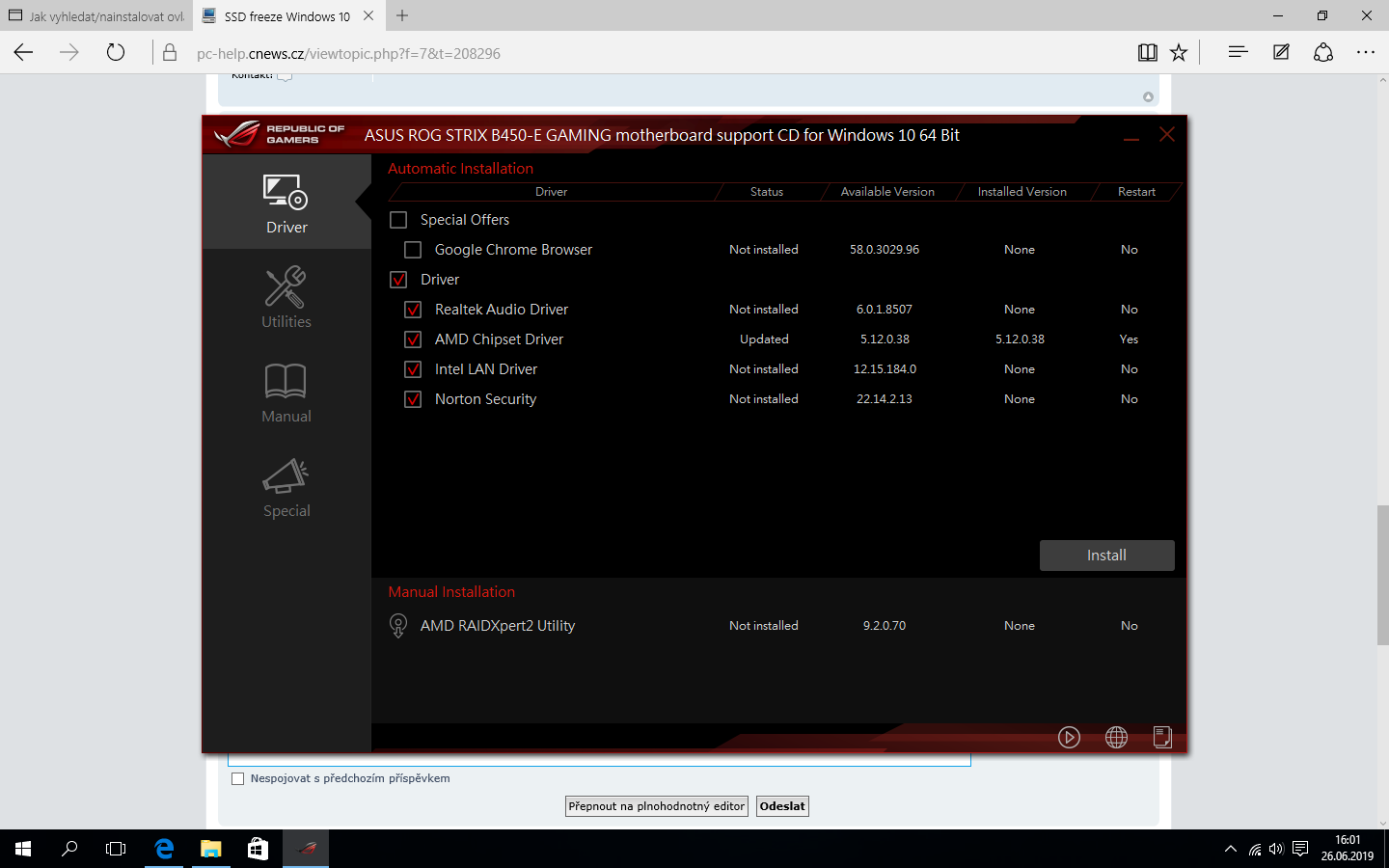 Podle obrázku máš chipset nainstalovaný nejnovější. Zruš ten zaškrtlej norton a můžeš doinstalovat LAN a AUDIO a potvrď tlačítkem install.