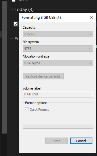Zkusil jsem formátovat na Fat32 i exFAT, obojí ale neúspěšně. Na NTFS je formátování asi v procesu, ale nějak zaseknuté.