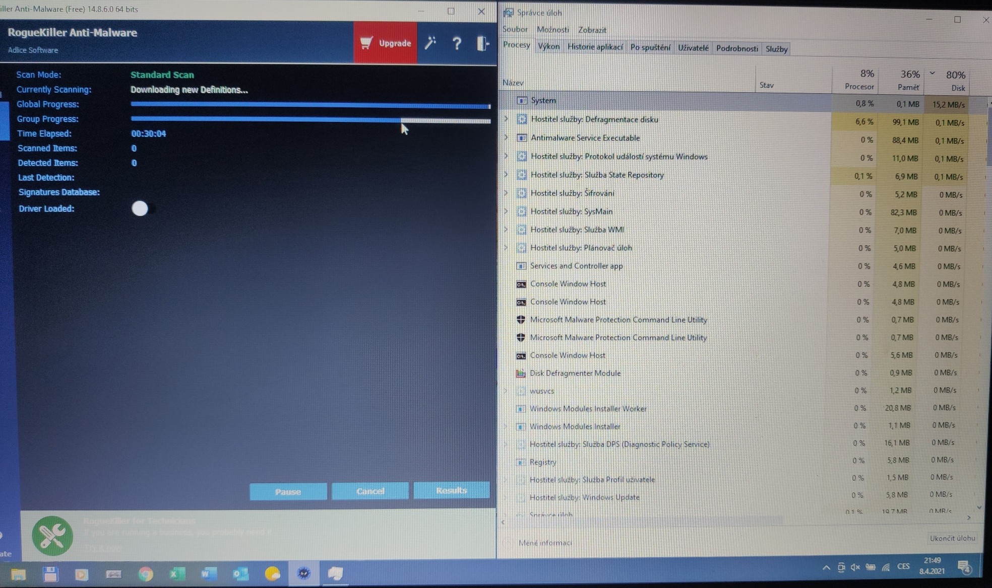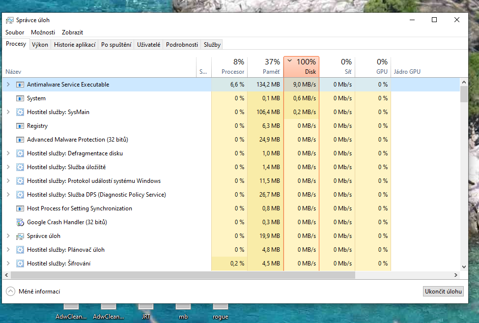 bud systém nebo antimalware service executable, a windows defender jsem vypl, momentálně neběží žádný antivirový program.
