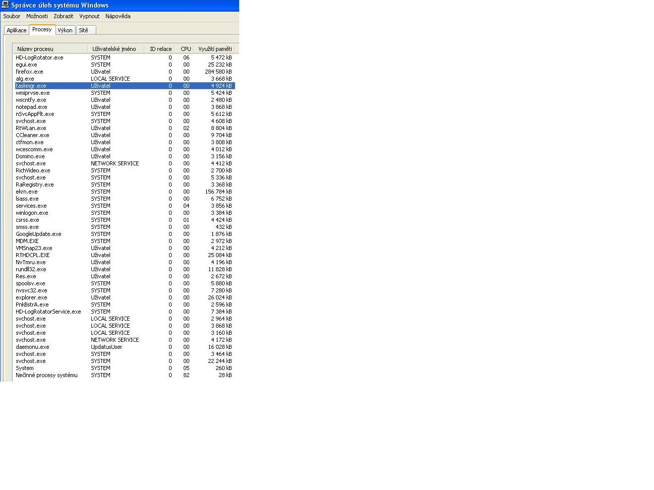 HD-LogRotator.exe, uživatelské jméno: Uživatel, CPU: 06, využití paměti 5 472 kB