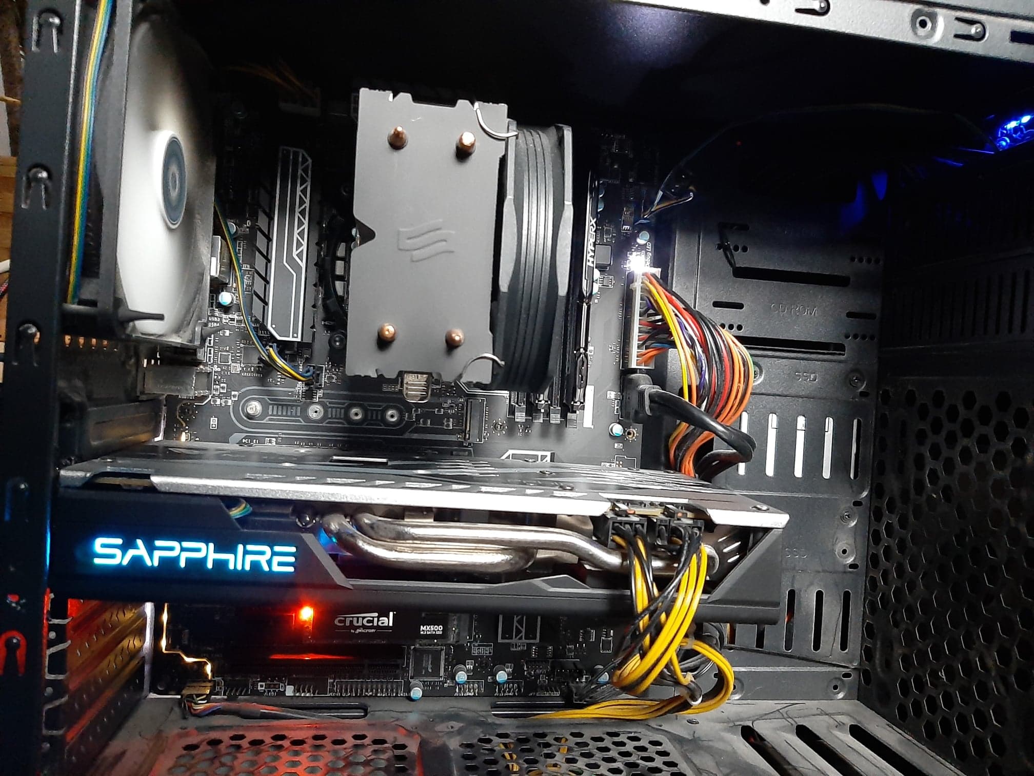 Ahoj, tak v poslední době opět problémy s monitory, i když spíš teda s grafikou, nebo kdo ví čím. Několikrát v posledních dnech mi nenaběhly monitory a tak jsem se k tomu dneska dostal a pročistil celý vnitřek. Po 1. zapnutí ovšem pc nenaběhl, jen pravidelně sem tam pípnul, vše se na pár vteřin roztočilo, probliklo a nic. A takhle pořád dokola. Vytáhl jsem na pár minut CMOS, dal zpátky a PC se rozběhl klasicky. Ovšem bez náběhu monitorů. Po tvrdém restartu se mi objevila na monitorech hláška viz obrázek 1. Jinak na obr. 2 posílám svůj vnitřek, jestli někdo neuvidí něco špatného pohledem, co jsem mohl přehlédnout.