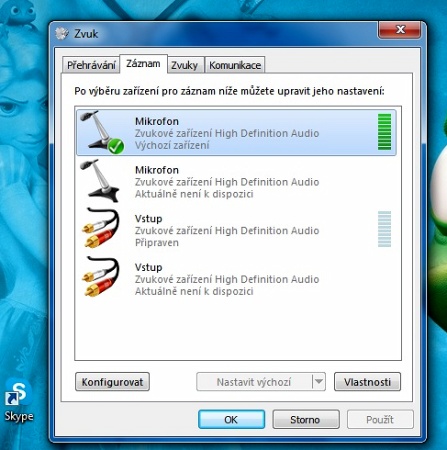 Tak se ukázalo, že mikrofon v Ovládacích panelech ( zvuk ) je OK. Přímo v Nastavení Skypu to, jak se zdá, nefunguje.